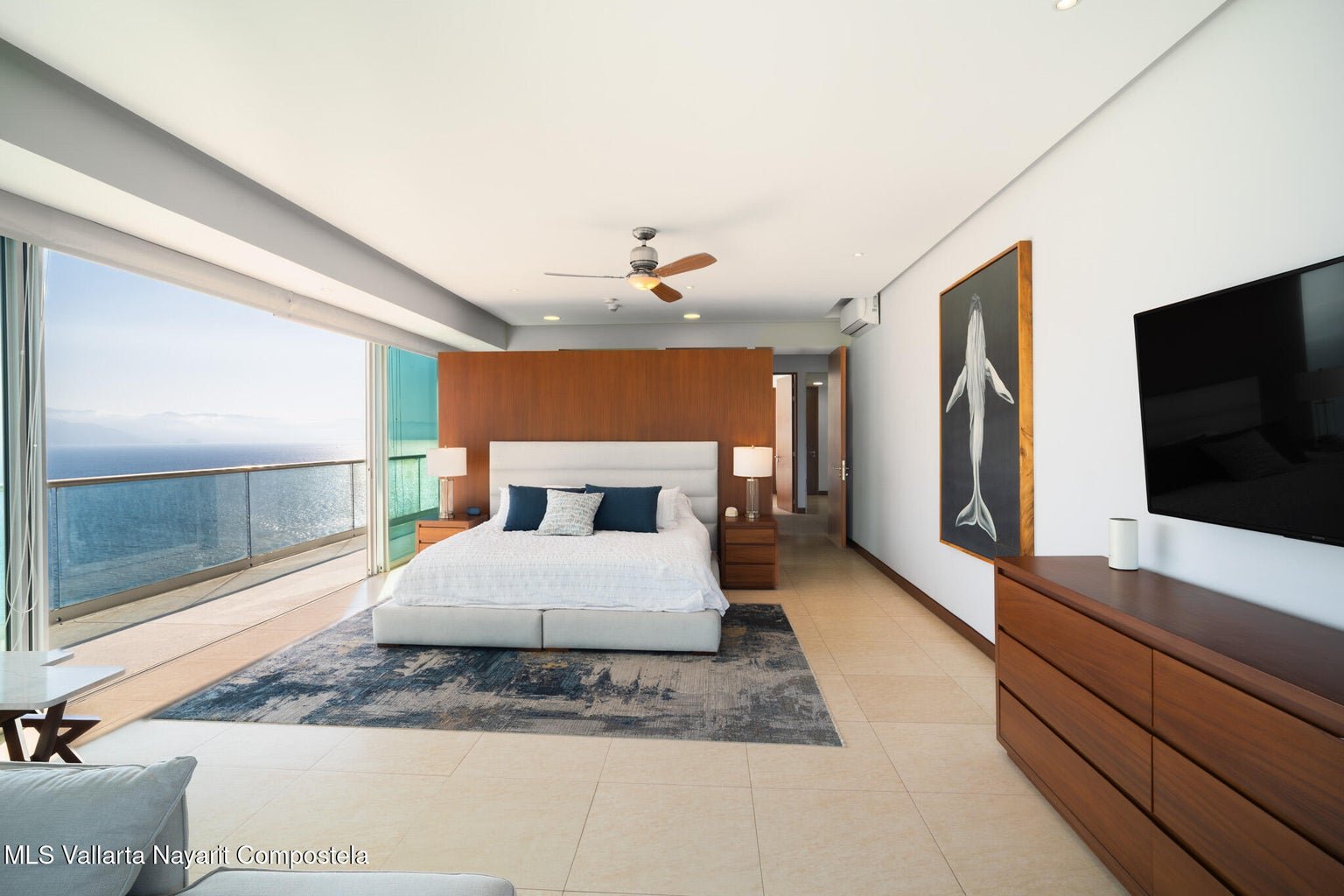 A defining feature of this unit is its wall of floor-to-ceiling windows. They bring in abundant natural light, helping the interiors feel airy and energized throughout the day. Just as importantly, they frame expansive views of the Pacific Ocean and the city skyline, turning the surrounding scenery into a living backdrop. Whether you’re seated in the main living area or moving through the open spaces, the view remains present—reinforcing the home’s oceanfront setting and creating that unmistakable sense of being connected to the coastline.